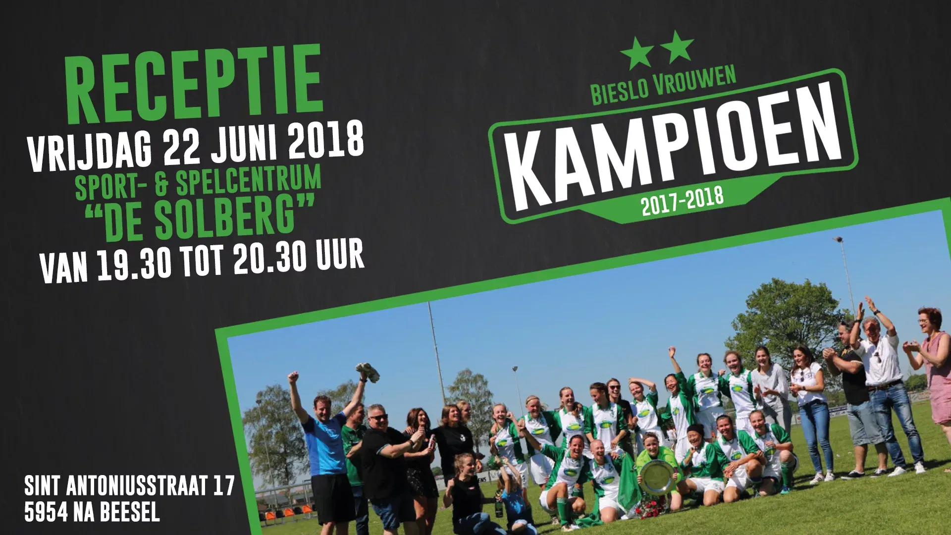 Op vrijdag 22 juni om 19:30 uur begint de kampioensreceptie van Bieslo Vrouwen 1. De receptie duurt tot 20:30 uur.