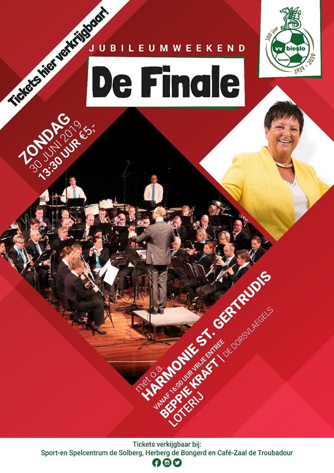 Aan het einde van elk groot toernooi of evenement is er een finale, zo ook bij het jubileumweekend! Een gezellige familiemiddag waar iedereen kan genieten van live muziek onder het genot van een drankje. Harmonie Beesel zal deze dag beginnen met een geweldig concert. Aansluitend zal Beppie Kraft een super optreden geven. Joekskepèl De Dorsvlaegels zal op deze dag ook hun muzikale talenten ten gehoren brengen. Zorg dat jij erbij bent!
