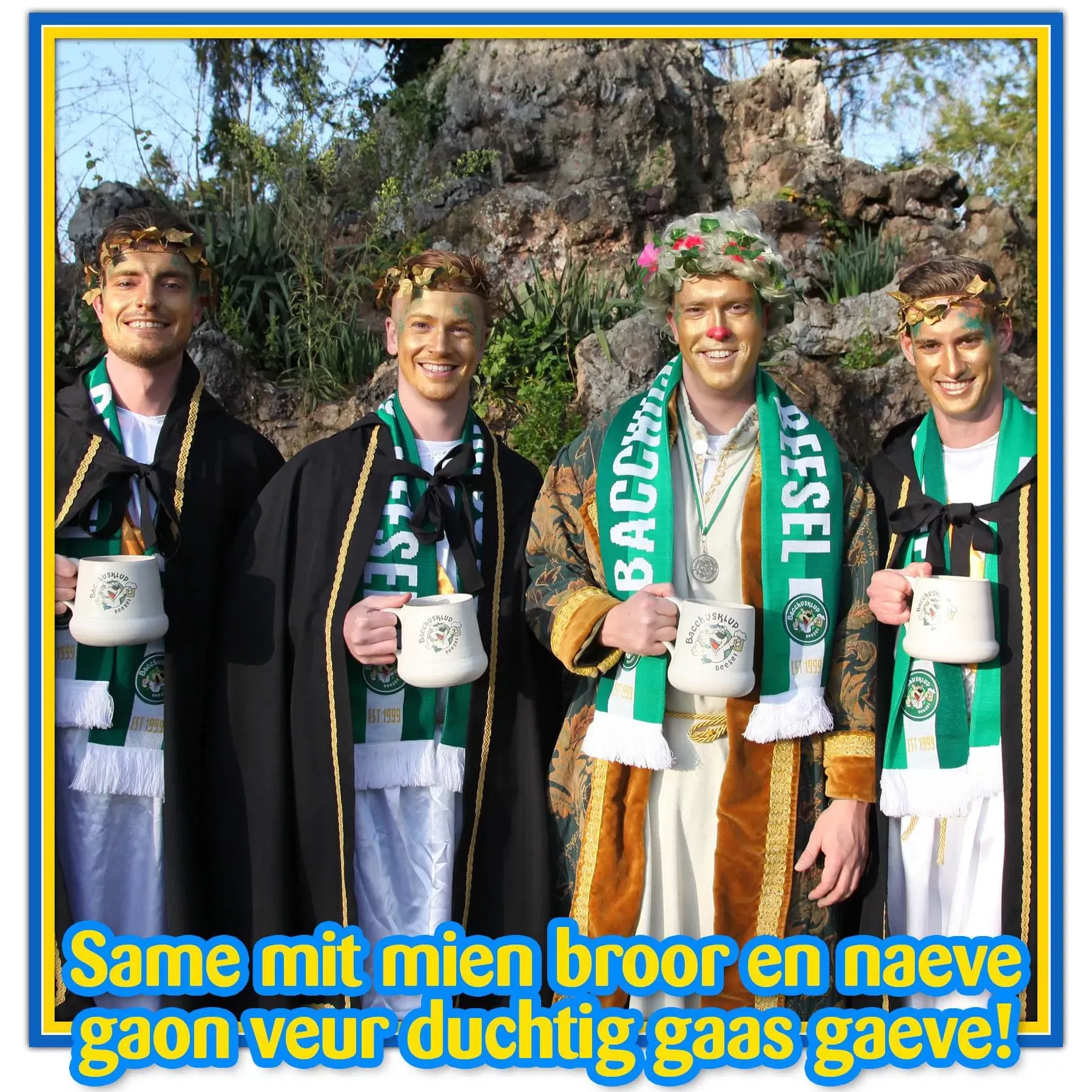 Afgelopen zaterdag is Ferd Beek, speler van de selectie van Bieslo, uitgeroepen als Bacchus van Beesel. V.V. Bieslo wenst Ferd, samen met zijn adjudanten Sjuul, Luc en Sjoerd, een geweldige carnaval toe.