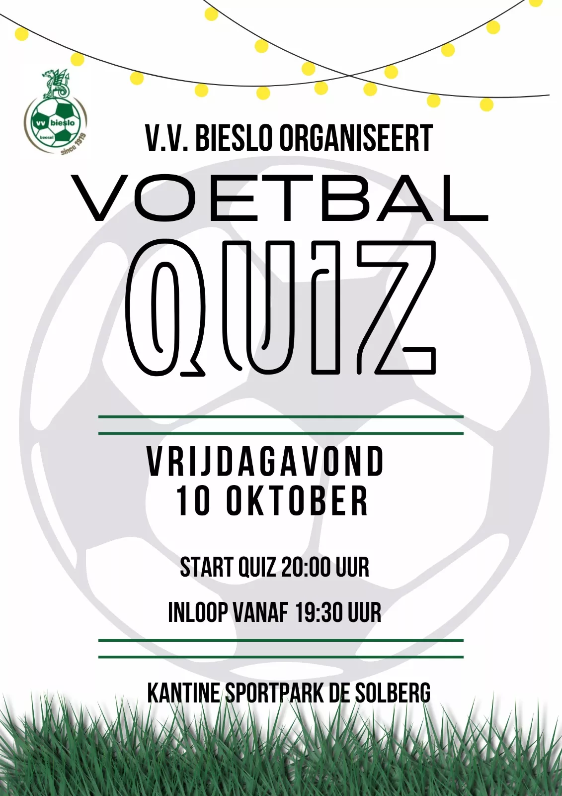 V.V. Bieslo organiseert op vrijdag 10 oktober de 1e grote Bieslo voetbalquiz. De voetbalquiz is voor jong en oud en gaat over diverse categorieën uit de voetbalsport. Test met je vrienden of teamgenoten je voetbalkennis en wie weet worden jullie de winnaars van deze 1e editie van de Bieslo voetbalquiz.