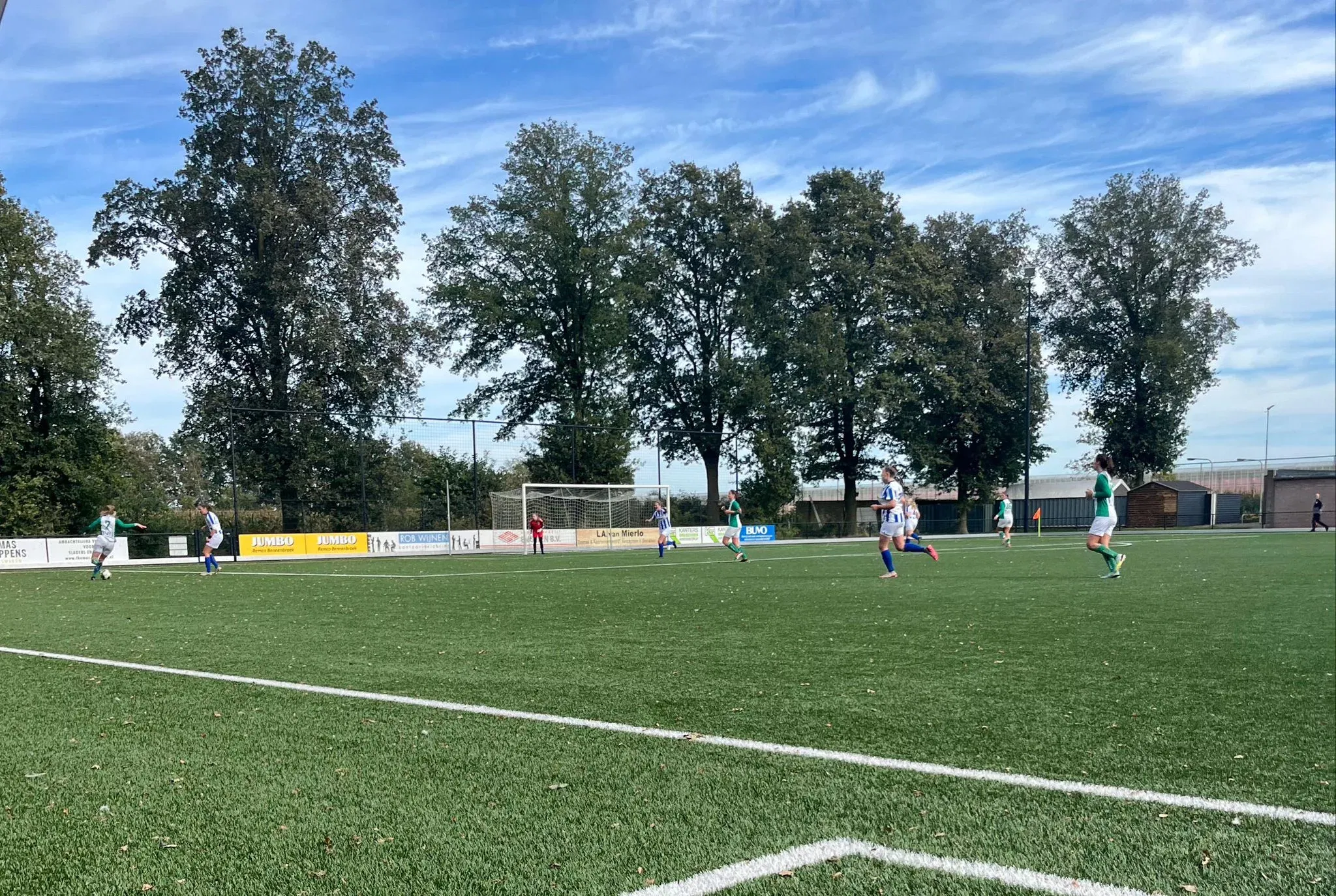 Zo goed als de dag was voor de boetepot, zo slecht werd het uiteindelijk voor Bieslo Vr1. In het begin van de wedstrijd hadden we de nodige moeite met het spel van Someren. Al in de derde minuut kwamen we door het ongelukkig wegwerken van een voorzet op achterstand, 1-0. Na een kwartier spelen zorgde een incident (natrappen door de tegenstander) er echter voor dat Bieslo de wedstrijd kantelde. Esmee nam hierin het voortouw, door na een goede actie langs de zijlijn met een voorzet Mila (Frits) te bereiken. Helaas kreeg laatstgenoemde de bal net niet goed onder controle, waardoor haar inzet over het doel vloog. In de 17e minuut was het Esmee zelf die na goed druk zetten de bal van de laatste vrouw van Someren afpakte. Koelbloedig zette ze de 1-1 op het scorebord. Bieslo bleef in die eerste helft steeds sterker worden, maar kon ondanks goede pogingen van Juliëtte en Esmee het net niet vaker vinden. Waar wij niet scoorden, lukte dat Someren wel… Met twee benutte corners kort achter elkaar brachten zij de stand terug naar een 3-1 voorsprong. Ondanks dat we de bovenliggende partij waren met de betere kansen, keken we dus tegen een ruime achterstand aan in de rust.