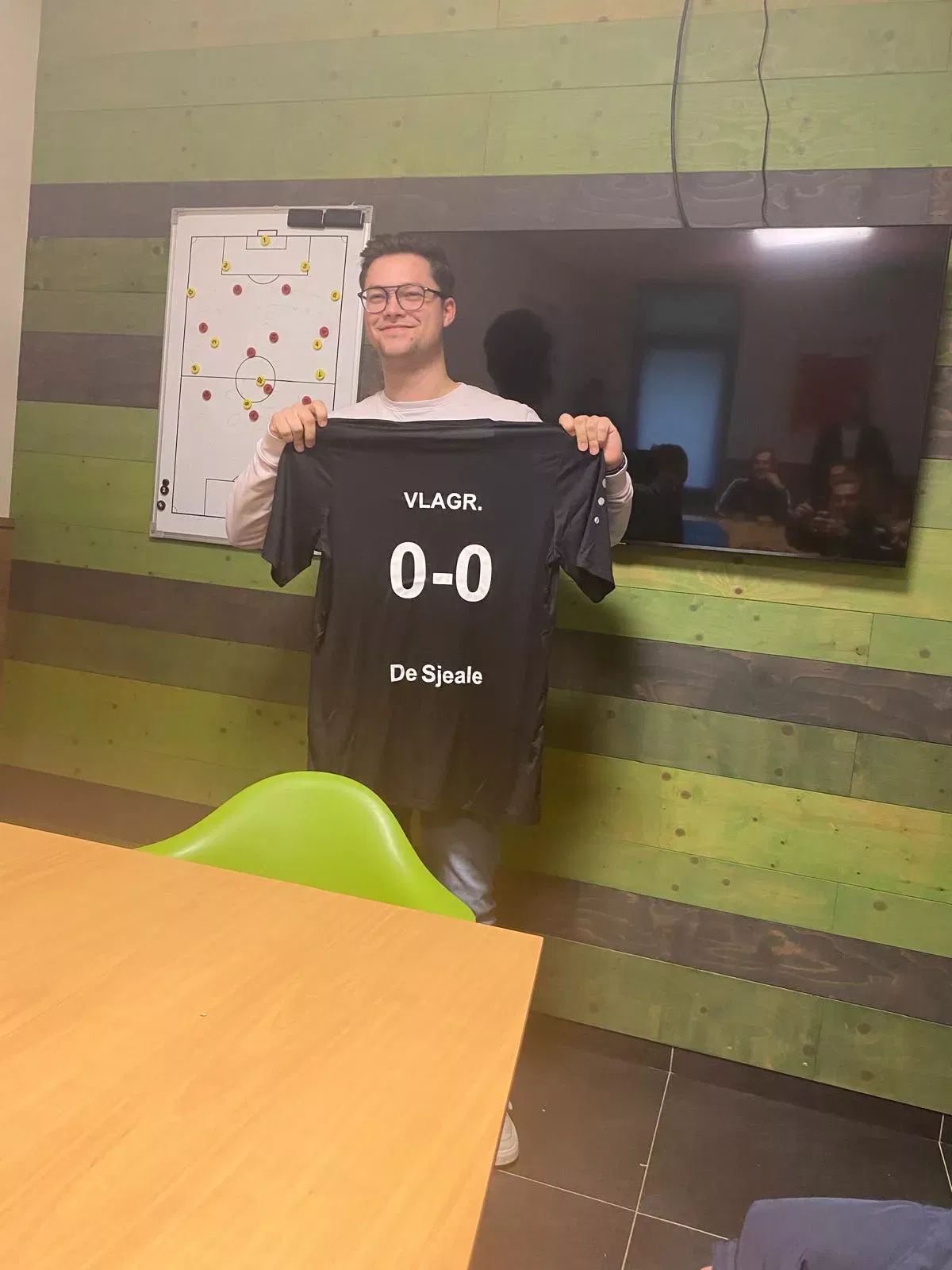 Zoals iedere zondig gaat denken de spelers van Bieslo 2 maar één ding, en dat is voetbal. Deze keer is het een thuiswedstrijd tegen EMS. De spelers van ’t twed verzamelen zoals gewoonlijk in de kantine van Bieslo. Tijdens de wedstrijdbespreking werd onze vlagger verrast door de spelers van het tweede (zie foto). Hiermee laten de spelers zien hoe blij ze zijn met de Sjeale. Door wat blessures en twee oliesjeiks die terug zijn naar hun geboorte land hebben we versterking gekregen van 3 gastspelers. Kay, Quint en Jitse Bedankt!